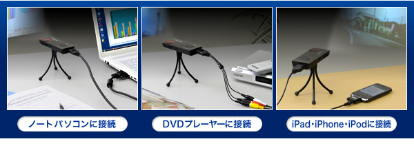 ノートPCやiPhone、iPad、iPodを接続して使える小型プロジェクター!