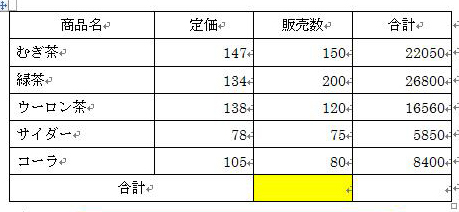 ※計算式を作成すると、数値データを参照して結果を求める「フィールドコード《が挿入されまが、通常フィールドコードは表示されず、結果が画面表示されます。