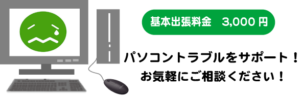 | 基本出張料金で、基本的なパソコン診断・相談をいたします。料金は、下記表をご覧ください。また、サポートメニューに記載がない場合でもお気軽にご相談ください。 |